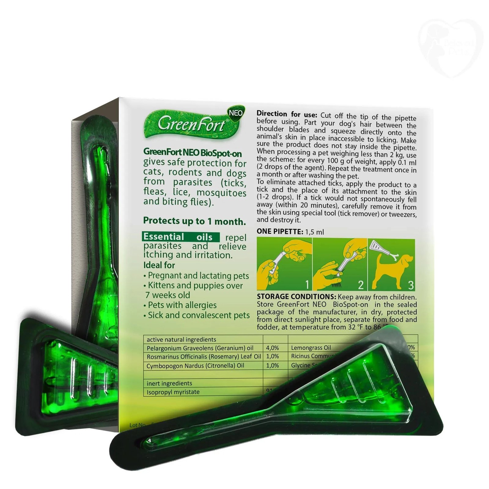 - absolutely safe and effective protection (made of natural ingredients). this dog and cat flea treatment made with natural essential oils and does not cause harm your pet. 100% natural and organic. greenfort neo bio spot-on is ideal and safe for pregnant pets, kittens and puppies over 7 weeks old, pets with allergies and sick pets. the flea control you can trust.